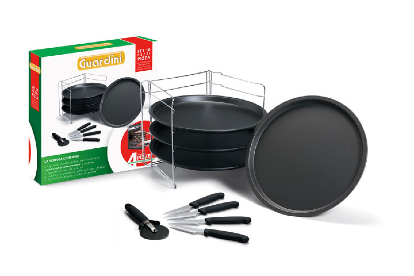 The set contains: 1 pizza rack (a chromed steel structure which allows you to cook 4 pizzas simultaneously); 4 pizza pans 32cm (made of steel with non-stick coating) that guarantee perfect cooking and easy release of pizzas of all kinds. There are also 4 pizza knives and 1 nylon pizza cutter wheel, that can be directly used on pans because it does not scratch the non-stick surface and leaves the non-stick properties intact. The Made in Italy quality of Guardini moulds offers the guarantee of excellent results in cooking, non-stick performances and release, as well as ease of cleaning after use, thanks to the quality of their non-stick coatings.