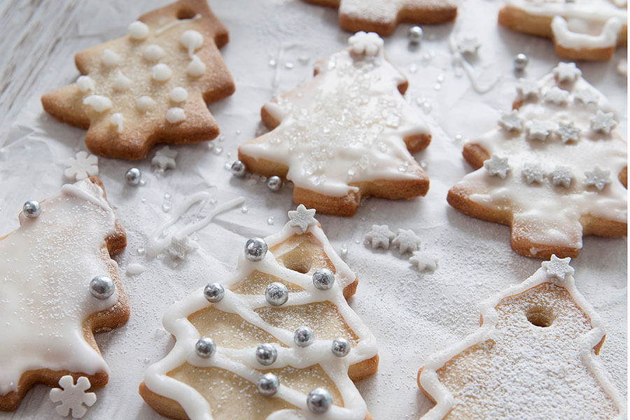 Roll out the dough on a lightly floured surface to 5 mm thick. Use a Christmas tree-shaped pastry cutter to cut out as many biscuits as possible, rerolling the trimmings as necessary. Make a small hole in the top of each biscuit with a skewer if you would like to hang them up with string later.