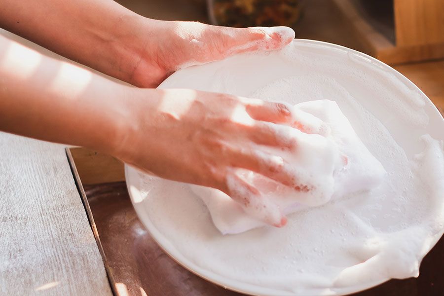 - Afin d’enlever les résidus obstinés, remplissez le plat d’eau chaude et de savon et laissez-le tremper pendant 10-20 minutes