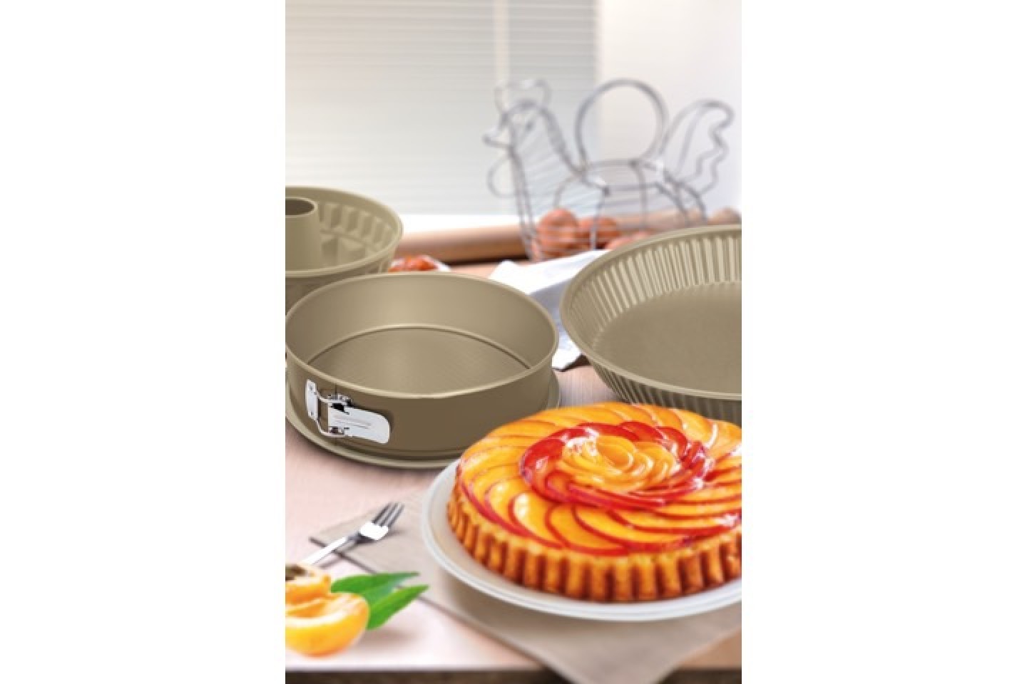 Una teglia pratica ma anche elegante? Per le tue crostate c’è lo stampo crostata della linea Gold Elegance! Realizzato con materiali innovativi e di altissima qualità, questo prodotto è l’ideale per preparare le tue crostate preferite. Infatti l’alta conducibilità termica dell’acciaio Hi-Top garantisce cotture perfette e sempre uniformi. Inoltre è privo BPA, PFOA e metalli pesanti e offre una grande resistenza ai graffi e all’usura. Si consiglia di utilizzarlo a una temperatura massima di 230 °C e di pulirlo accuratamente dopo l’uso. Lo stampo crostata della linea Gold Elegance è disponibile con diametro di 28 cm e altezza di 4 cm.