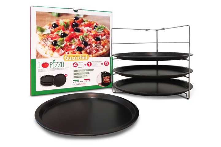 La scatola contiene: 1 griglia porta pizze (la struttura in acciaio cromato che permette di cuocere contemporaneamente 4 pizze), 4 tegami pizza da cm 28 (realizzati in acciaio con rivestimento antiaderente) che garantiscono la cottura perfetta e la facile sformatura di pizze di tutti i generi. La qualità Made in Italy degli stampi Guardini offre la garanzia di ottimi risultati di cottura, di antiaderenza e di sformatura grazie alla qualità dei rivestimenti antiaderenti con i quali sono realizzati, oltre che la facilità di pulizia dopo l’uso.
