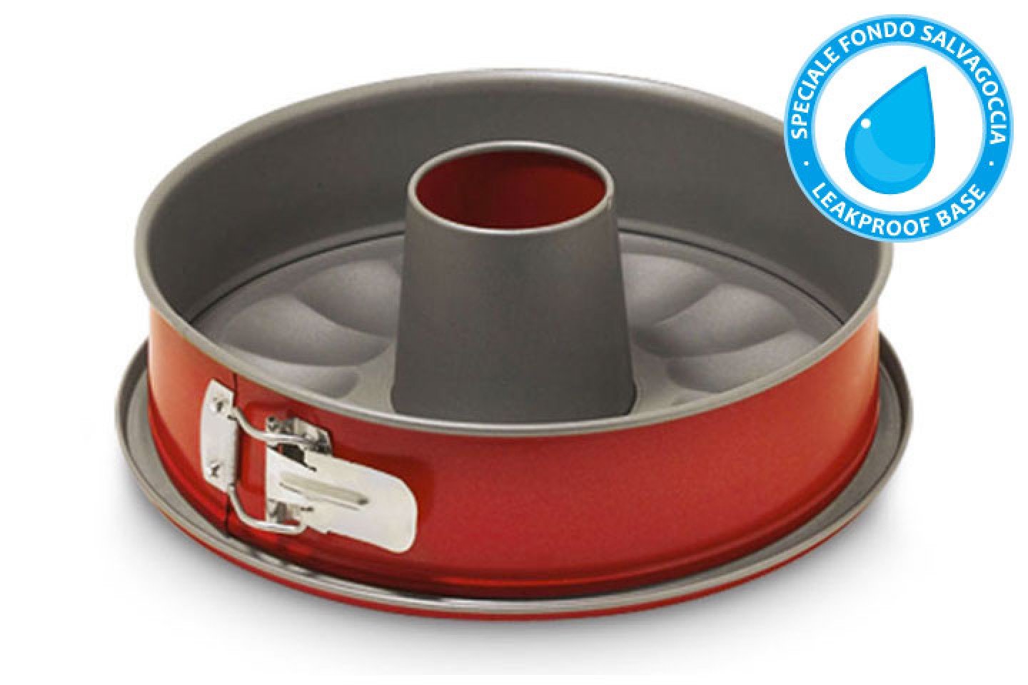 La tortiera apribile 2 fondi della linea Rossana comunica tutta la fantasia e la passione per la cucina. Dal caratteristico colore rosso vivo, questo stampo è dotato di un doppio fondo interscambiabile, per fare sia torte classiche che ciambelle. Grazie all’elevata conducibilità termica e al basso spessore dell’acciaio utilizzato, la cottura in forno di cibi sia dolci che salati risulta rapida e uniforme. Il rivestimento antiaderente di qualità superiore, inoltre, assicura ottimi risultati nella sformatura e nella cottura dei piatti, e facilita la pulizia dello stampo dopo l’uso. Infine, un tocco di ricercatezza e funzionalità esclusivo: lo speciale fondo salvagoccia, che consente di evitare la fuoriuscita dell’impasto dallo stampo, mantenendo perfettamente puliti il forno e il piano di lavoro. È disponibile con diametro di 24, 26 o 28 cm e altezza di 7,7 cm.